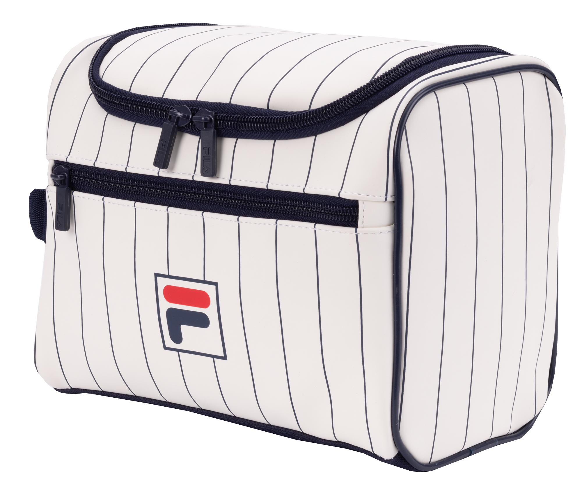 Kulturbeutel im Heritage-Pinstripe – kompakt, robust und ideal für Pflege-Essentials.