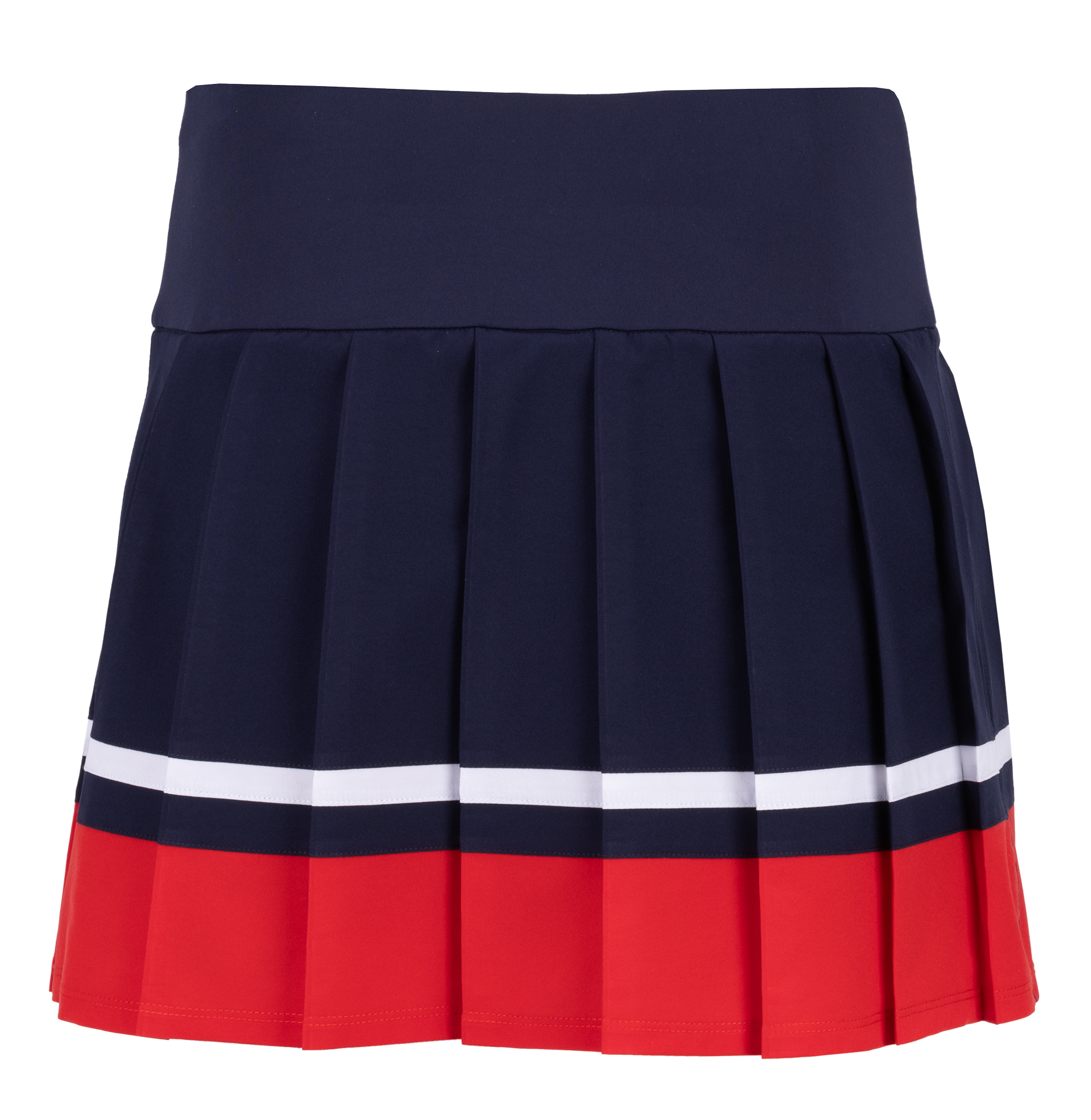 Skort Sabine Girls - ein rundum Faltenrock. Die klassischen Fila-Farben sind in Streifen angenäht. Ein hoher Bund mit innliegendem Tape ergänzen das sportliche Design. Kleines F-Box Logo auf der linken Bundseite und eine eingenähte Ballhose runden den Rock ab. Lässt sich zu Sportarten wie Tennis, Golf und Padel tragen.