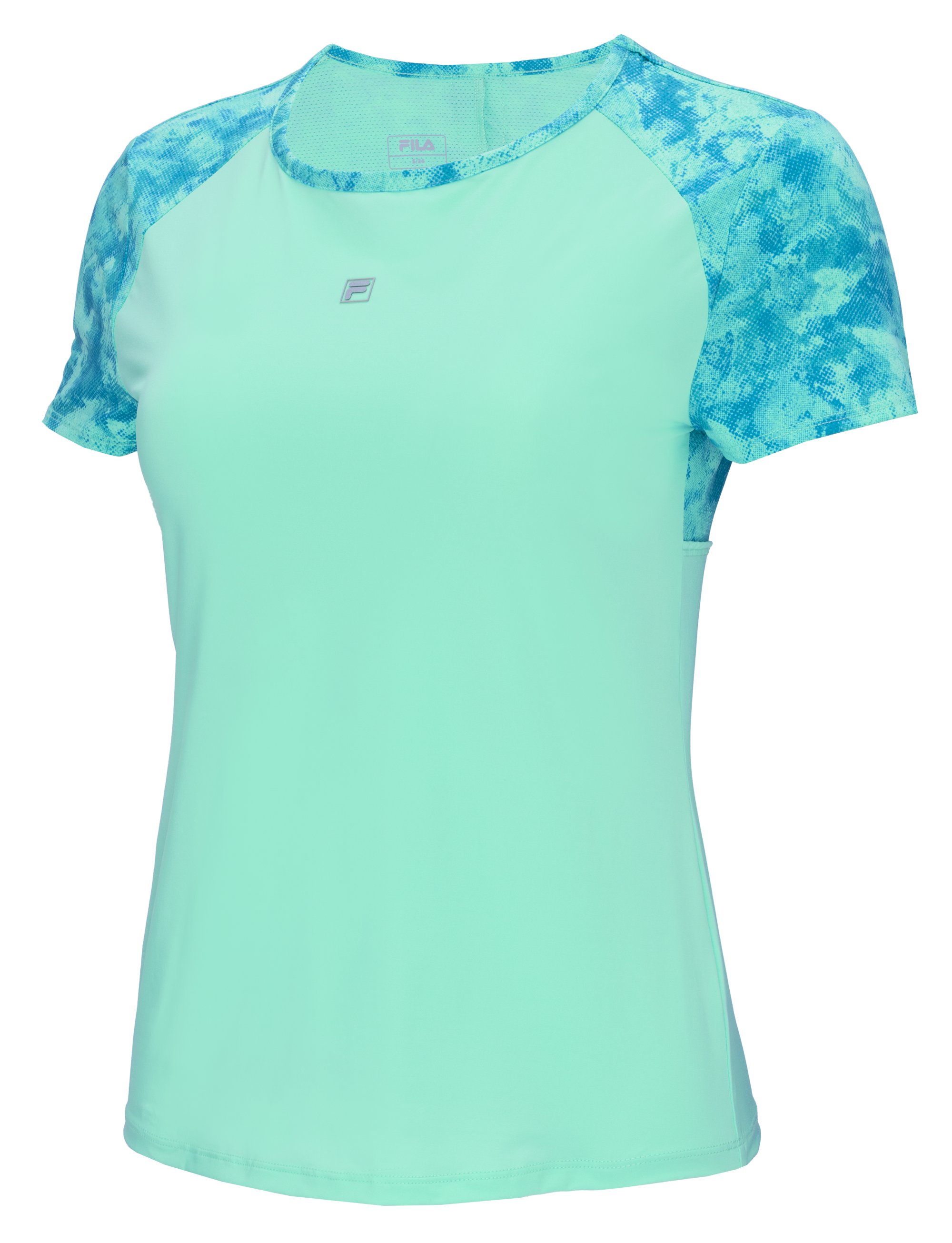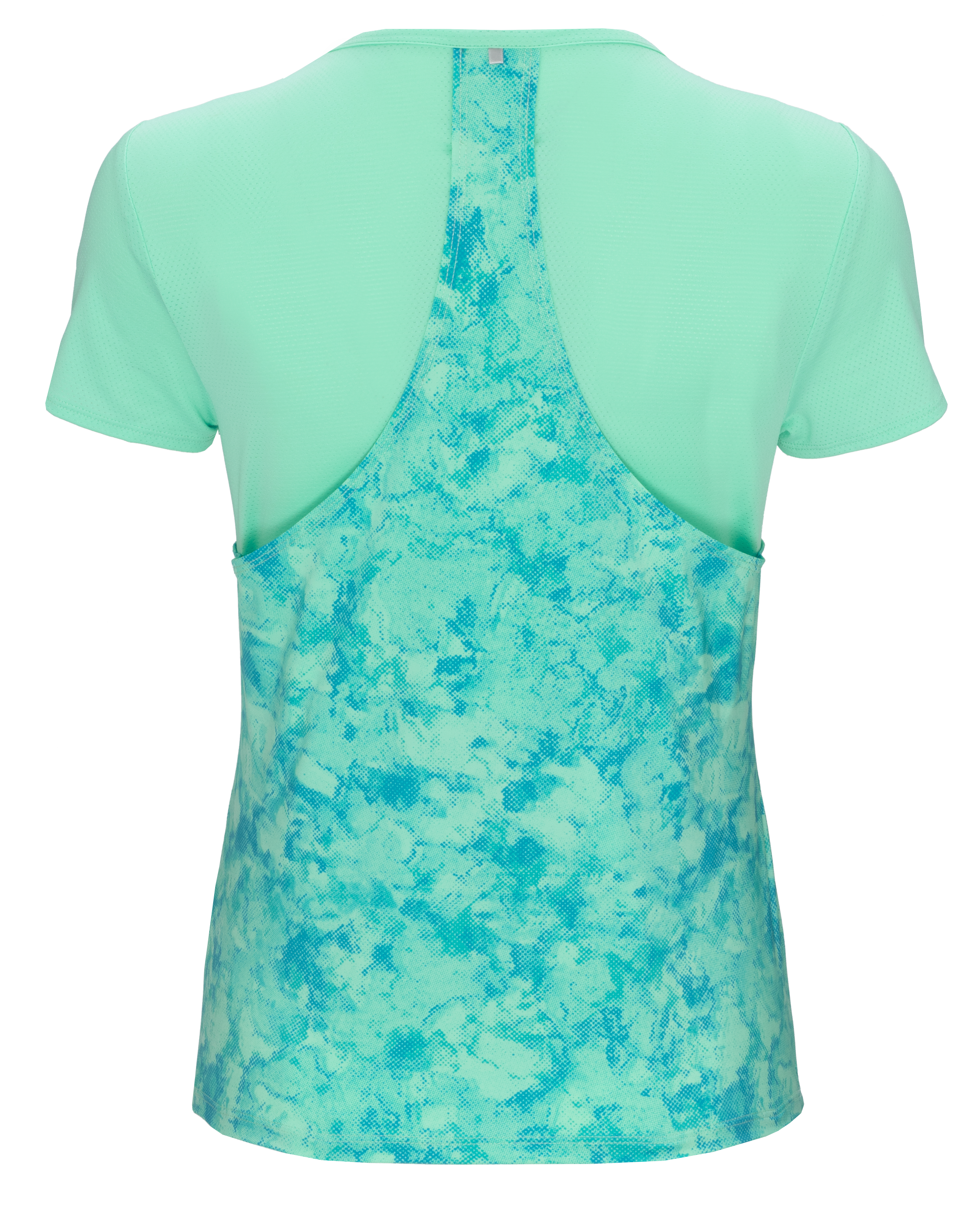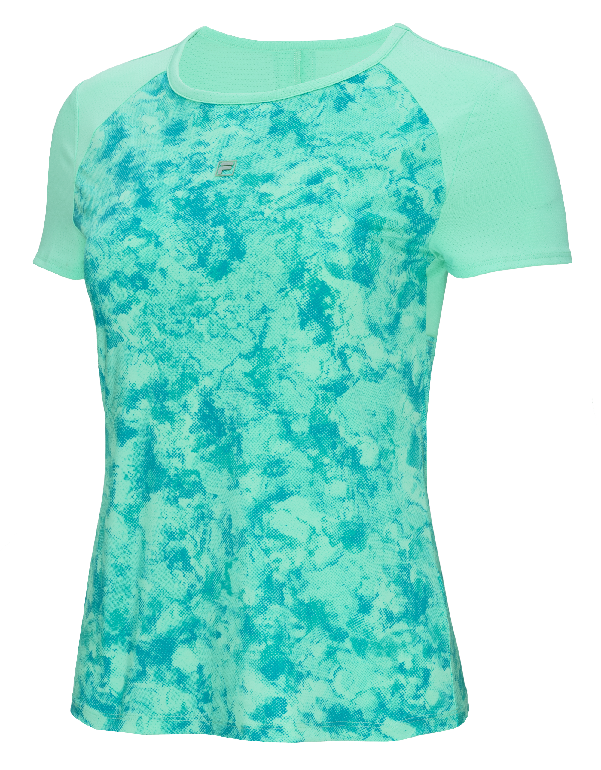 T-Shirt Beatrice - pfiffiges, zweiteiliges Shirt. Oberes Rückenteil mit angeschnittenen Ärmeln aus gemustertem, perforiertem Stoff. Vorderteil und unteres Rückenteil aus einfarbigem Nylon. Kleines F-Box-Logo auf der Brust.